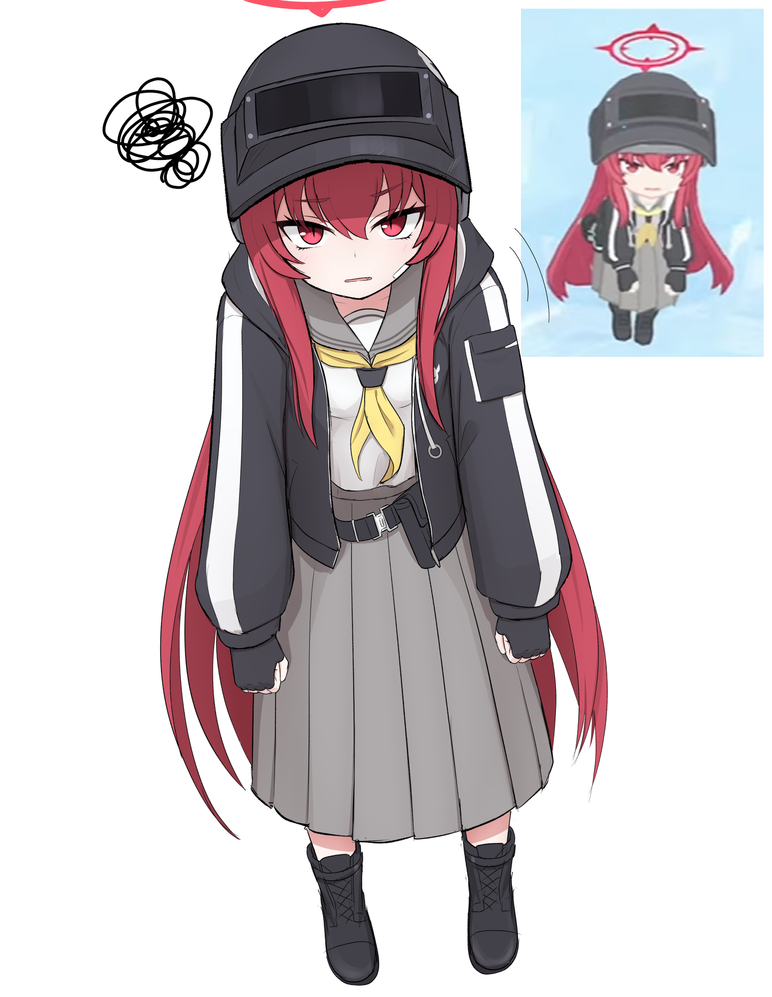 1girlaltyn helmetasuparuchbandage on cheekbeltblack bootsblack glovesblack helmetblack jacketbootsbrown sailor collarbrown skirtcombat helmetfangfingerless glovesfloatinggame screenshot insetgloveshair between eyeshalohelmethoodhooded jacketjacketlong hairlong skirtlong sleeveslooking at viewerneckerchiefparted lipsred eyesred hairred halosailor collarschool uniformserafukuskirtsolosquigglevery long hairwhite serafukuyellow neckerchief