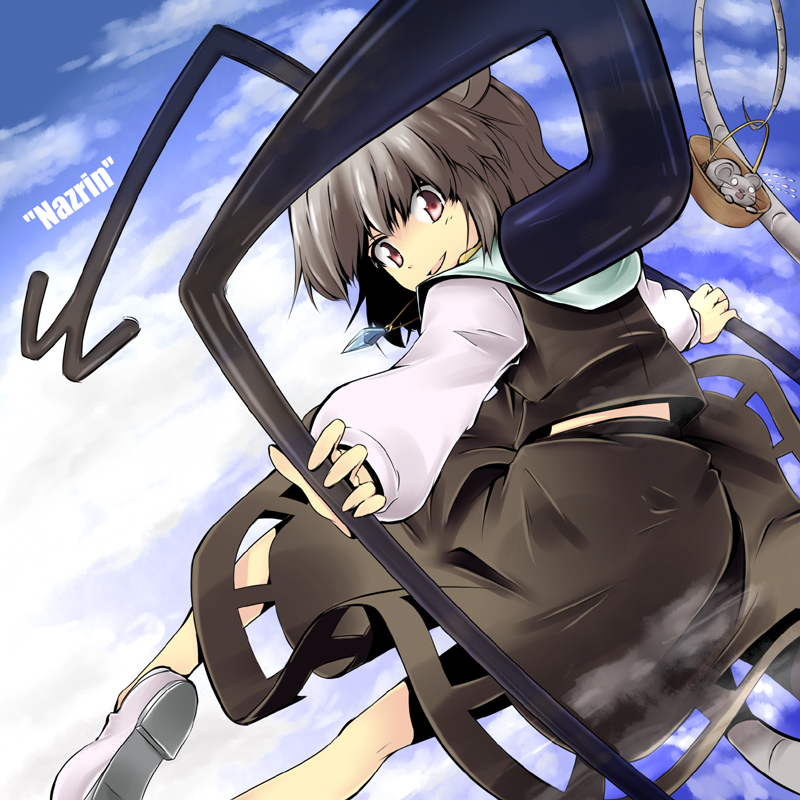 1girlanimal earsblushbrown hairfemale focusfrom behindlooking at viewerlooking backmouse (animal)mouse earsmouse tailred hairsolosticktail
