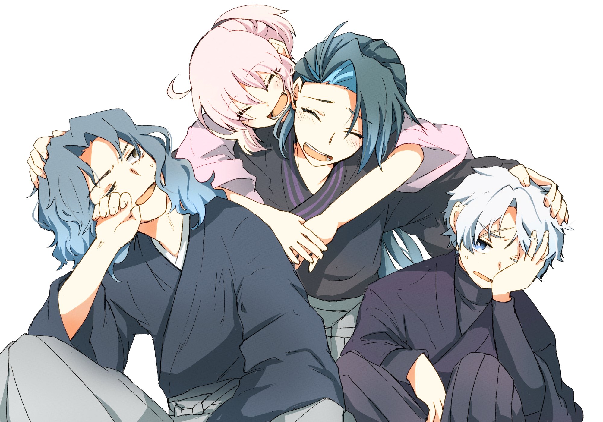 1girl3boysahogeblack hairblack hakamablack kimonoclosed eyesgrey hairgrey hakamahakamahand on another's headhand on own facehughug from behindjapanese clotheskimonolong hairlong sleevesm0m0kawa2medium hairmultiple boysone eye closedopen mouthpink hairpink kimonoponytailscarscar on facescar on foreheadsimple backgroundsittingsmilesweatwavy hairwhite backgroundwhite hairwide sleeves
