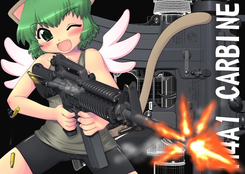 1girlanimal earsassault riflebare shouldersbike shortsblushcameltoecasing ejectioncat earscat tailfangfemale focusfiringgreen eyesgreen hairgunholdingholding gunholding weaponm4 carbinematching hair/eyesmuzzle flashone eye closedrifleshell casingshort hairsmilesolotailweaponwingswink