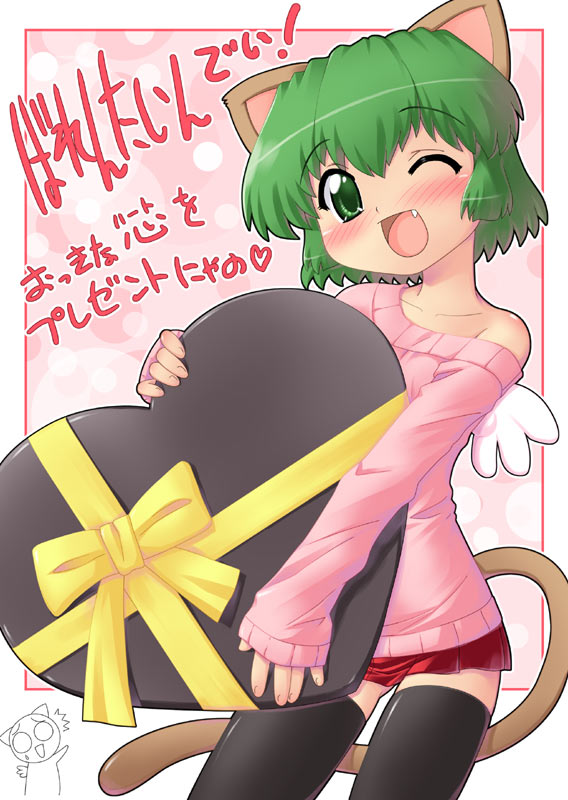 1girlanimal earsbare shouldersblushcat earscollarbonefangfemale focusgiftgreen eyesgreen hairheartholdingholding giftlong sleevesmatching hair/eyesminiskirtone eye closedribbonshort hairskirtsleeves past wristssmilesolothighhighsvalentinewingswinkzettai ryouiki