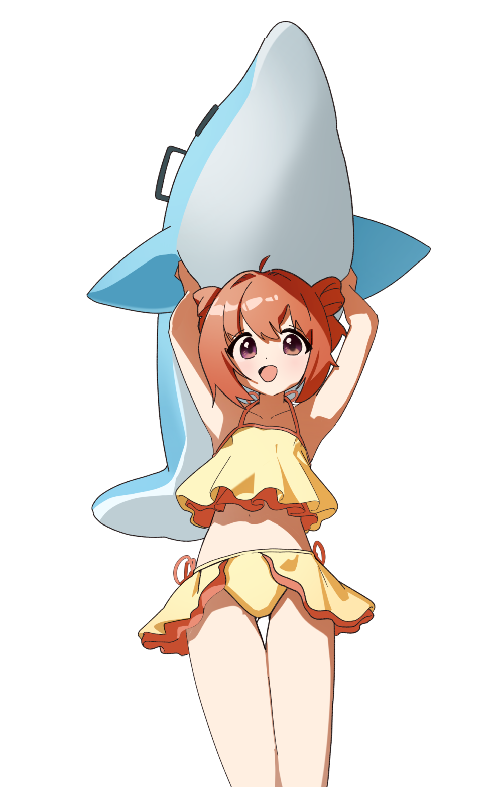 1girlahogearmpitsarms upbikinidouble bunfrom belowhair bunhair ornamenthalterneckholdinginflatable toymidriffnavelpurple eyesred hairruffle bikinishort hairsidelockssimple backgroundsoloswimsuittwintailstwo side upwhite backgroundyellow bikini