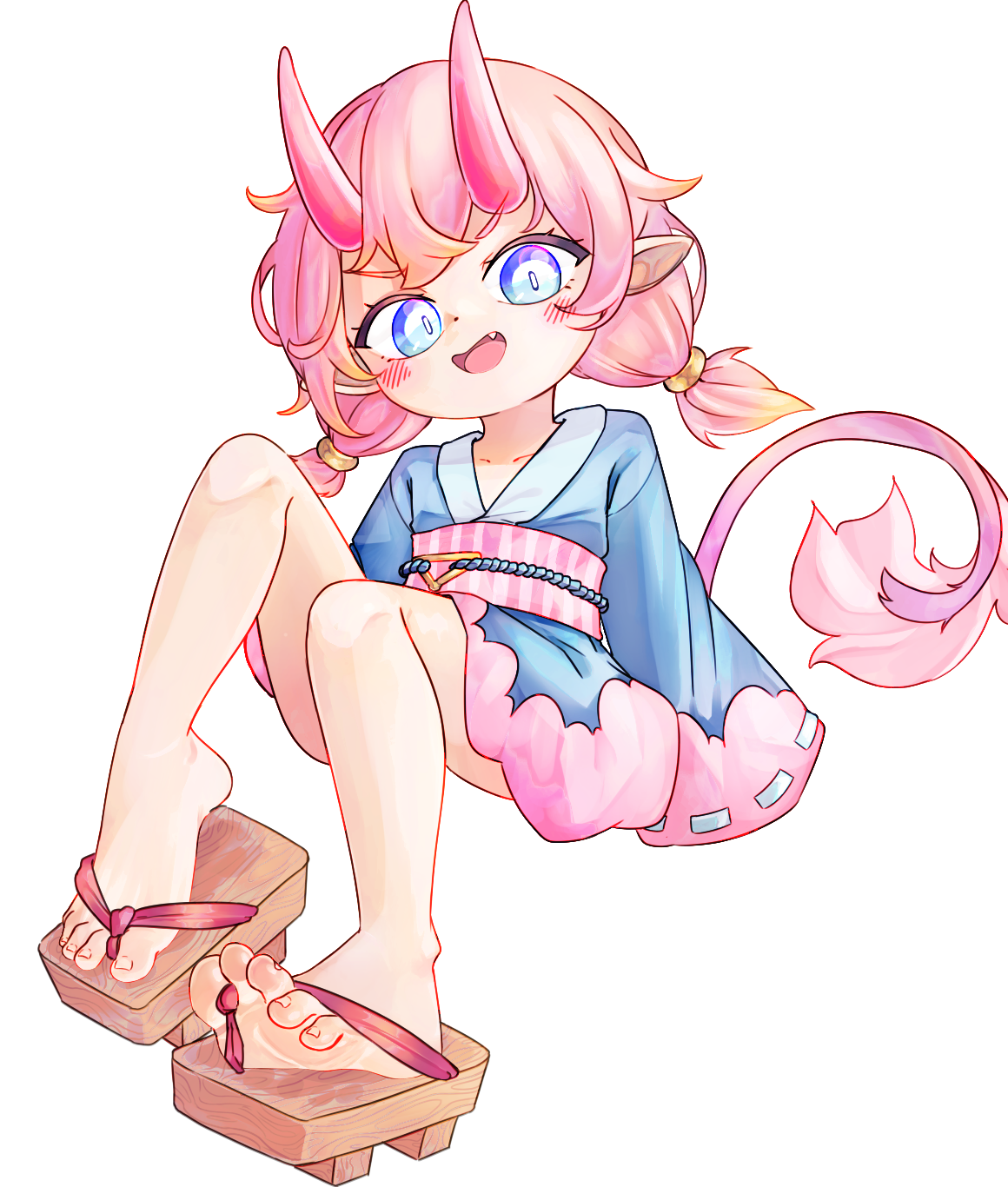 1girlblue eyesfangfeetfull bodygetahornsjapanese clotheskimonookoboopen mouthpink hairplatform sandalssandalssimple backgroundsolotailtoenailstoeswhite background