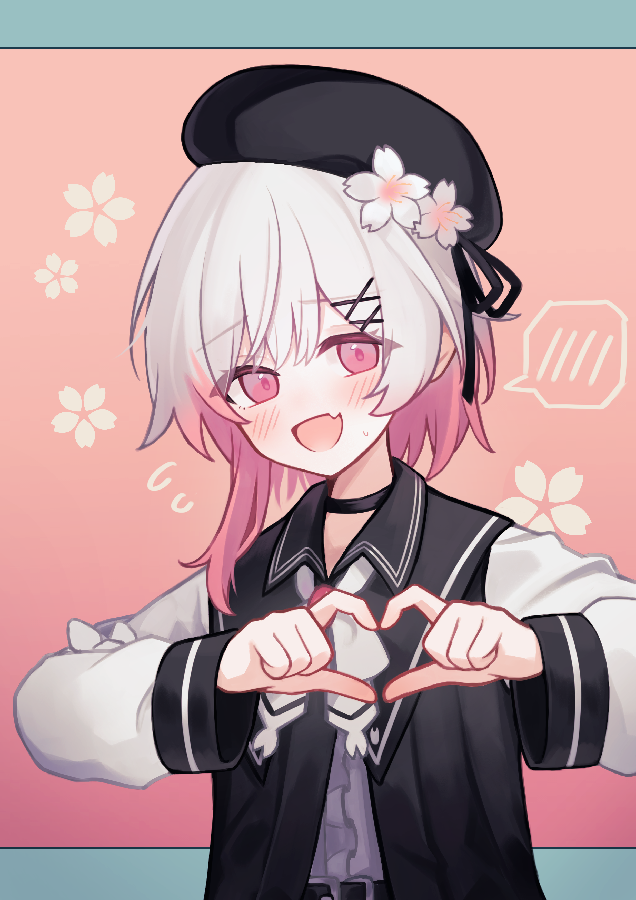 :d1girlblack chokerblack hatblack jacketchokerfangflowerfour-finger heart handsgradient hairhair flowerhair ornamenthatheartheart handsjacketlong hairlong sleeveslooking at viewermulticolored hairopen mouthpink eyespink hairskin fangsmilesolospeech bubblespoken blushtwo-tone hairupper bodywhite hairx hair ornament