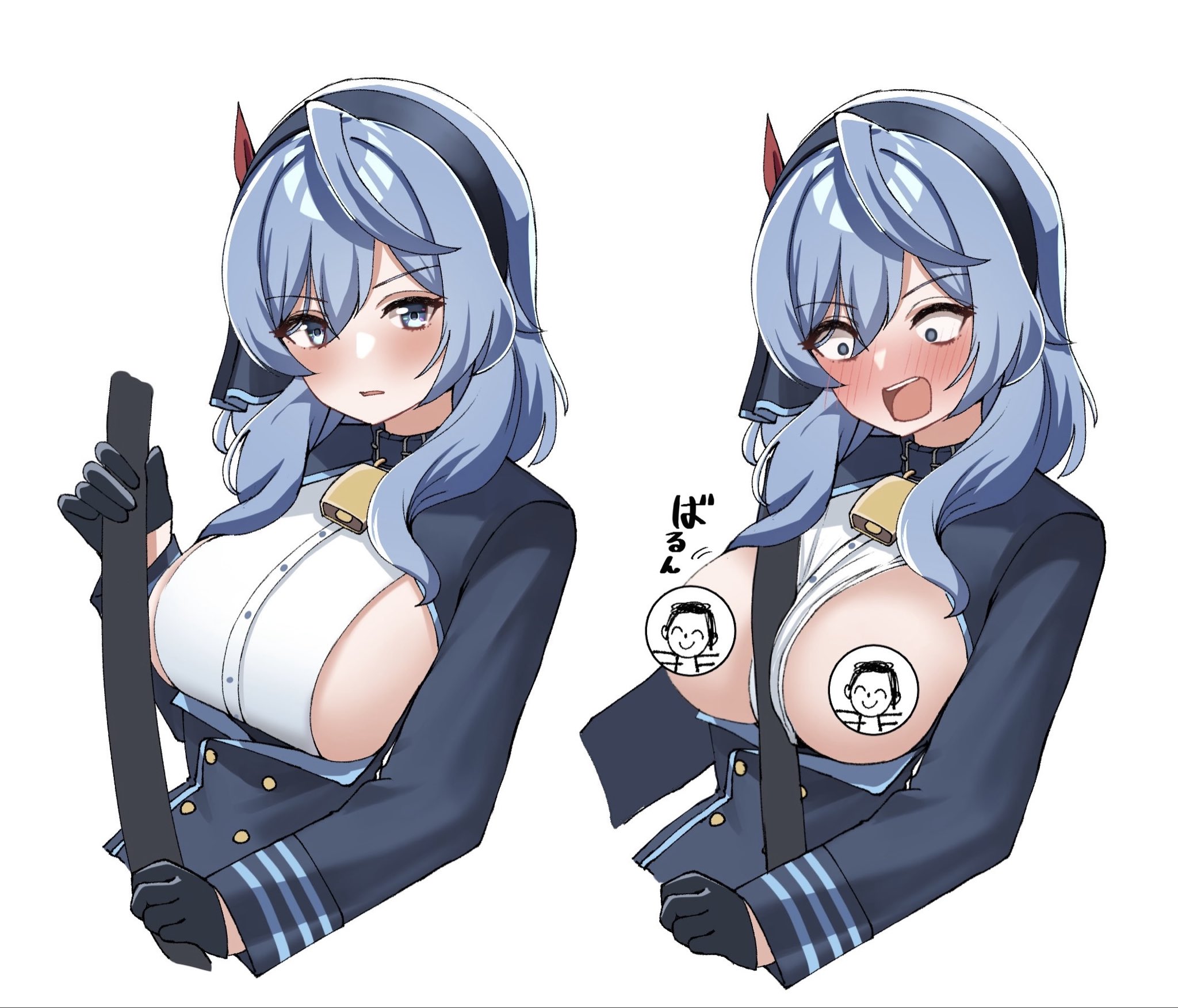 1girlaccidental exposurebellblack glovesblack hairbandblack ribbonblue eyesblue hairblue jacketblushbreastsbreasts outbuttonscensoredconstricted pupilscowbelldouble-breastedembarrassedeyes visible through hairgloveshair between eyeshair ribbonhairbandhand upjacketlarge breastslong sleeveslooking at viewerlooking downmedium hairmotion linesmultiple viewsneck bellno branose blushnovelty censoropen mouthribbonseatbeltshirtsideboobsideless shirtsound effectsteethtsurimeupper bodyupper teeth onlyv-shaped eyebrowswhite shirtwide-eyed