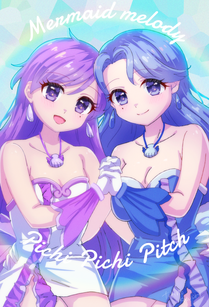 2girlsbare shouldersblue dressblue eyesblue hairblushbreastscleavageclosed mouthcollarbonedressearringsholdingholding handsjewelrylong hairlooking at anotherlooking at viewermedium breastsmolemole under eyemultiple girlsnecklaceopen mouthpurple eyespurple hairshellshell earringsshell necklacesmilestraplessstrapless dressvery long hair