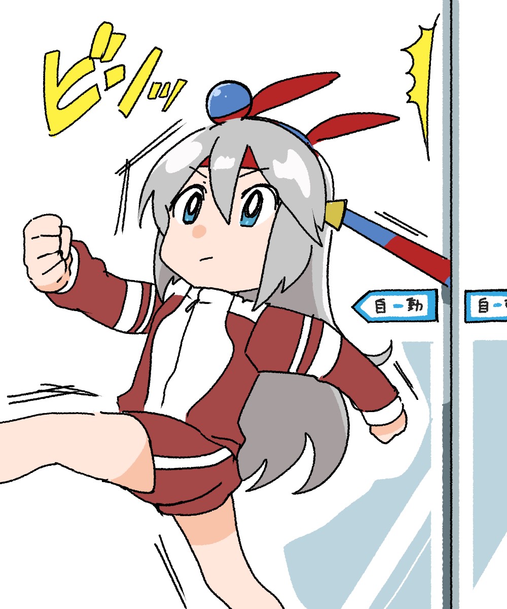 1girlanimal earsautomatic doorblue eyesblue hairbandbowear bowear coversear ornamentffzm0grey hairgrey tailhair between eyeshairbandheadbandhorse earshorse girljacketlong hairlong sleevesred headbandschool uniformshirtstriped clothesstriped hairbandtracen school uniformvery long hair