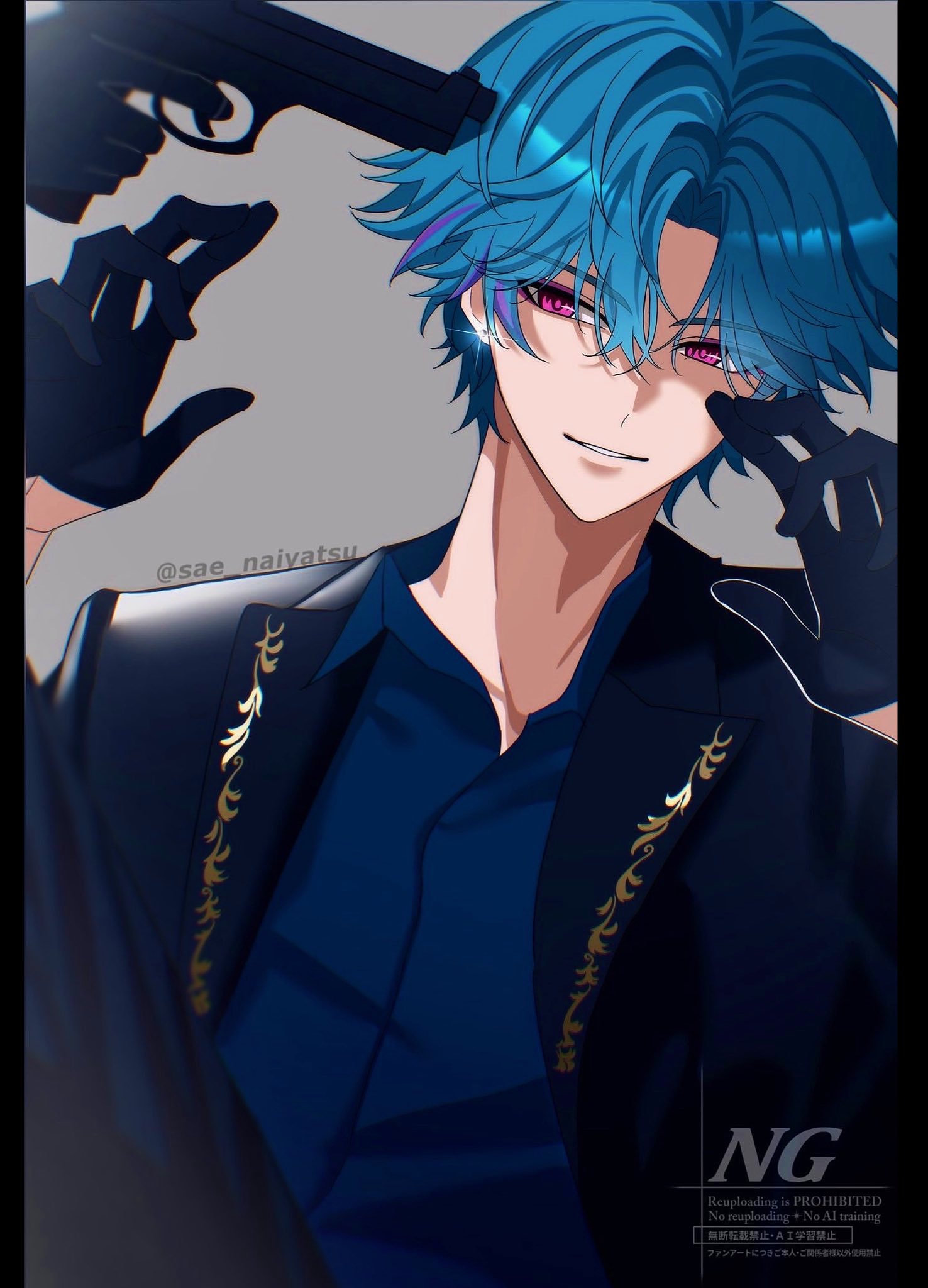 1boyarms upblack glovesblue hairblue jacketblue shirtclosed mouthcollared shirtglovesgungun to headholdingholding gunholding weaponjacketlapelslooking to the sidemale focusopen collarparted bangsparted hairpillarboxedpink eyessae naiyatsushirtsideways glancesmilesolo focussuit jacketweapon