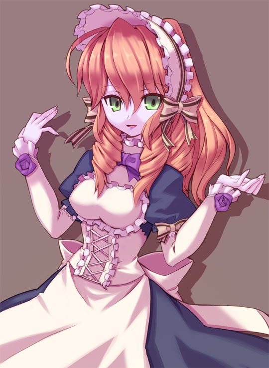 1girlaproncowboy shotfemale focusfrillsgreen eyeslong hairlooking at viewermaidmaid apronmaid headdressorange hairpuffy short sleevespuffy sleevesshort sleevessimple backgroundsolowrist cuffs