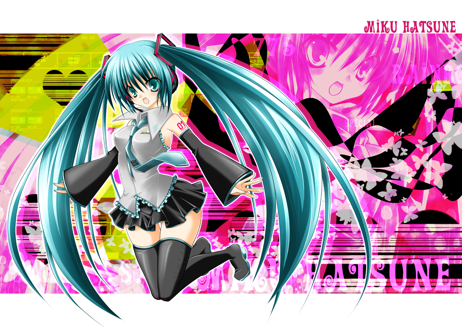 bootsdetached sleevesgreen eyesgreen hairheadphonesjumpinglong hairmicrophonesolothigh bootsthighhighstwintails