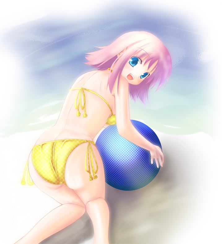 :d00s1girlall foursassballbeachballbikiniblue eyesbutt crackfemale focuslooking backopen mouthpink hairshort hairside-tie bikini bottomsmilesoloswimsuityellow bikini