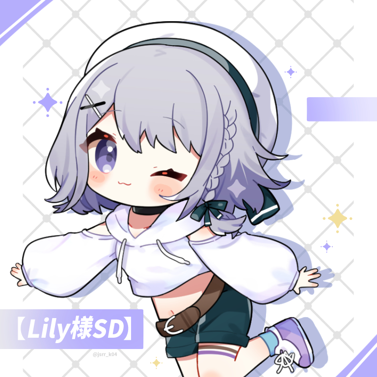 :31girlbare shouldersblack bowblack shortsblue socksblushbowbraidcharacter namechibichibi onlyclosed mouthcowboy shotcrop topcropped hoodiedrawstringdrop shadowgrey hairhair bowhair ornamenthoodhood downhoodielily (singasongll)long sleeveslooking at viewermidriffnavelone eye closedpurple eyespurple shoesshoesshort hairshortssmilesockssolotwitter usernamevirtual youtuberwhite backgroundx hair ornament