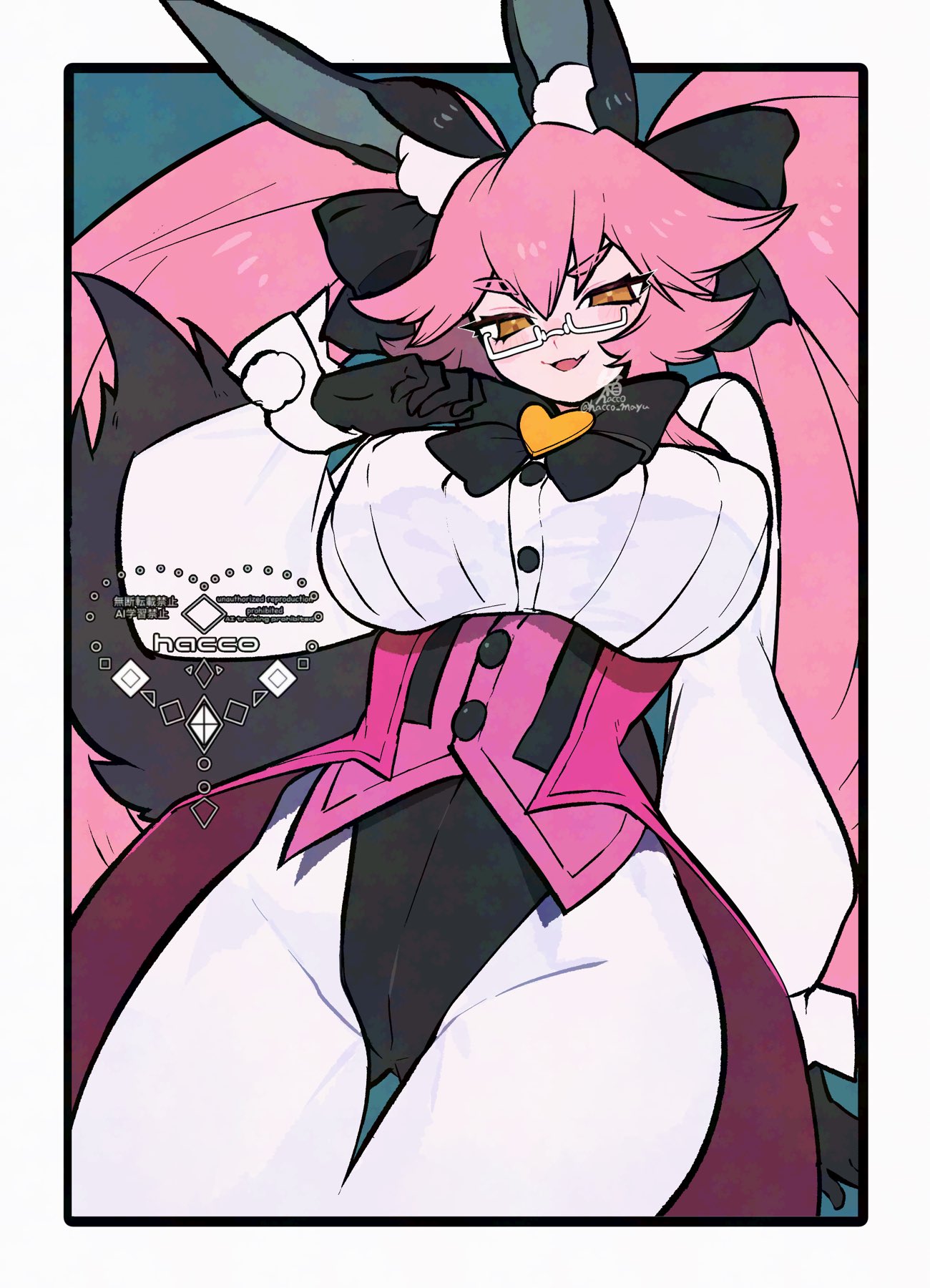 1girlanimal ear fluffanimal earsblack bowblack glovesblushbowbreastscoattailscollared shirtcorsetdress shirtfox tailglassesgloveshair between eyeshair bowlarge breastslong hairlong sleeveslooking at vieweropen mouthpantyhosepink hairrabbit earsshirtsidelockssmilesolotailthighstwintailsunderbustwhite pantyhosewhite shirtyellow eyes