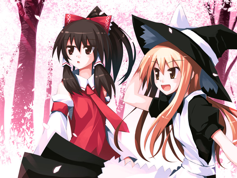 2girlsblonde hairbowbrown haircherry blossomsdetached sleevesfemale focushair bowhatjapanese clotheslong hairmikomultiple girlsponytailsarashiwitchwitch hat