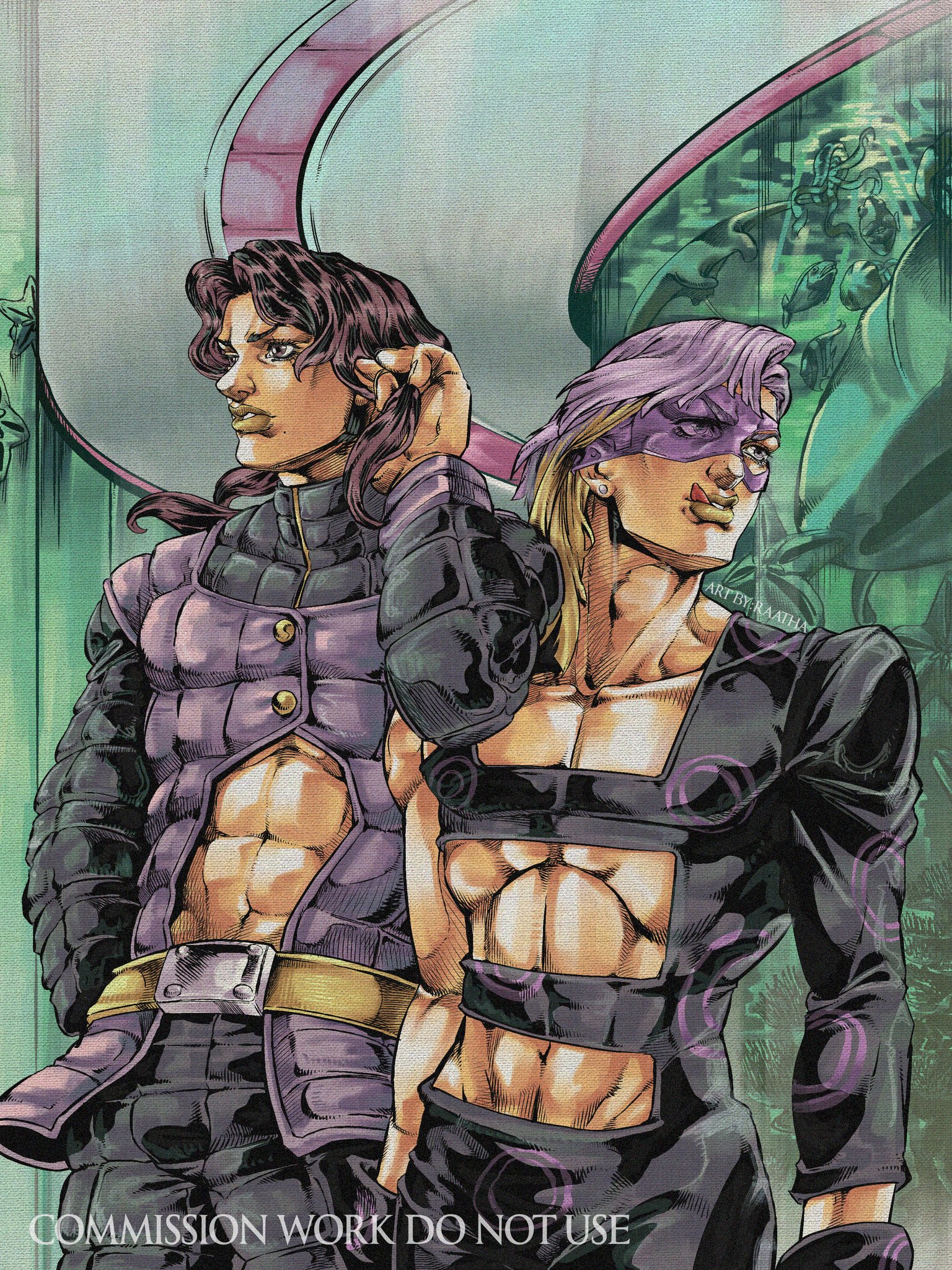 2boysabsaraki hirohiko (style)beltbelt buckleblack pantsblonde hairbucklecleavage cutoutclothing cutoutcoatdomino maskearringseye maskfaux traditional mediagrey eyeshand in own hairjewelrylicking lipslong hairlooking to the sidemale focusmaskmulticolored hairmultiple boyspantspurple coatpurple hairpurple maskstandingtonedtoned maletonguetongue outtwo-tone hairyellow beltyellow lips
