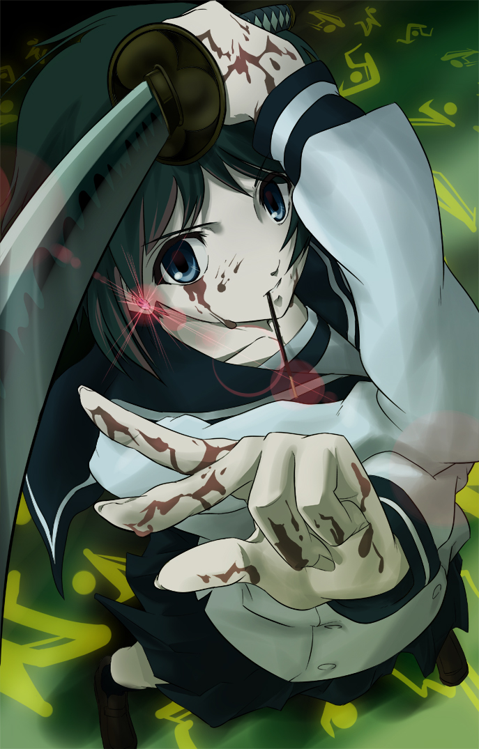 00s1girlbloodblue eyesbrown hairfemale focusfoodfrom abovelooking uppockyschool uniformserafukushort hairsoloswordweapon