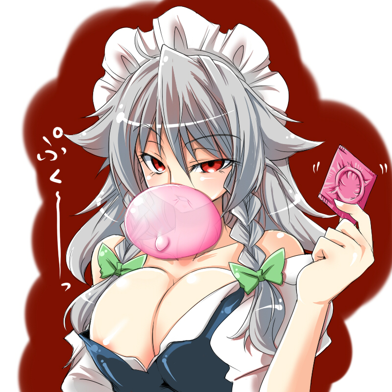 1girlareola slipblushbody blushbowbraidbreastsbreasts squeezed togethercleavageclothes downcollarbonecondomcondom in mouthfemale focusgrey hairhair bowheadbandhuge breastslarge breastslooking at viewermaidmaid headdressmouth holdnaughty facenipple slipnipplesoff shoulderopen clothesopen shirtred backgroundred eyesshiny clothesshiny skinshirtsolotwin braidsupper body