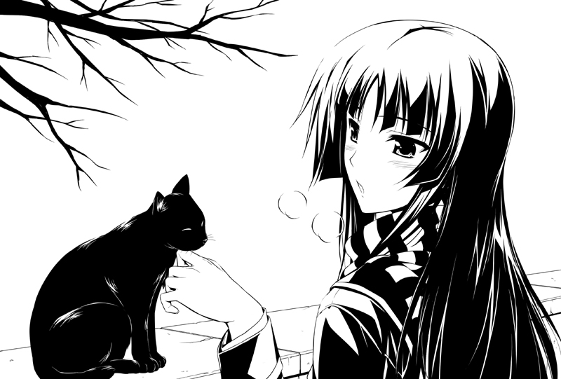 00s1girlblunt bangsblushbreathcatgreyscalehime cutlong hairmonochromeopen mouthscarfstriped clothesstriped scarftree