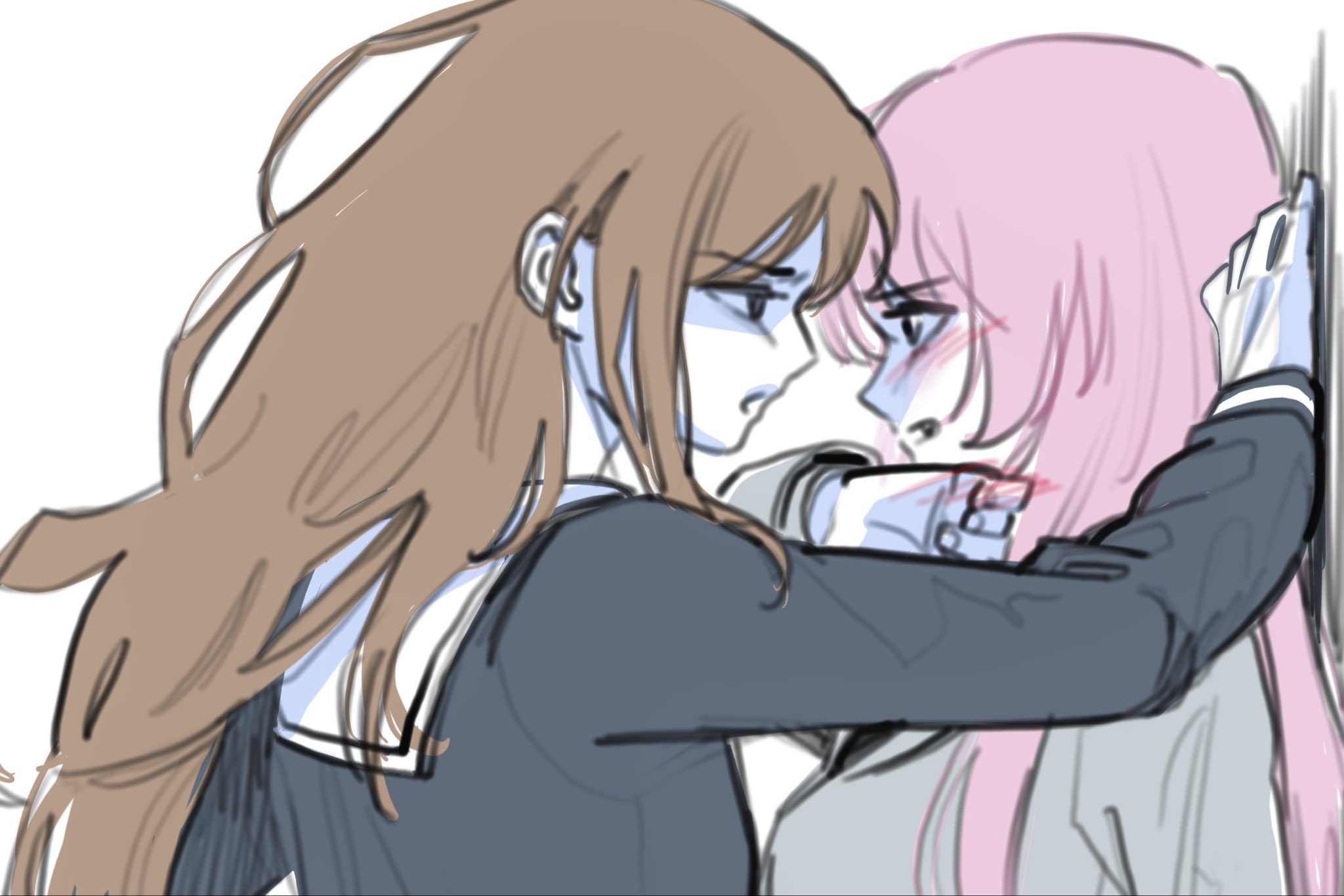 12thfog2girlsblack shirtblushbrown hairfanggrey jackethand blushhaneoka school uniformjacketkabedonlong hairmultiple girlsopen mouthpink hairschool uniformshirtsimple backgroundtsukinomori school uniformwhite backgroundyuri