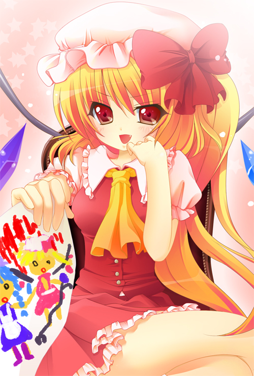 inuzuka bouru, flandre scarlet, hong meiling, embodiment of scarlet devil, touhou, bad id, bad pixiv id, 2girls, blonde hair, blush, female focus, flower, green eyes, hat, hug, mob cap, multiple girls, red hair, wings