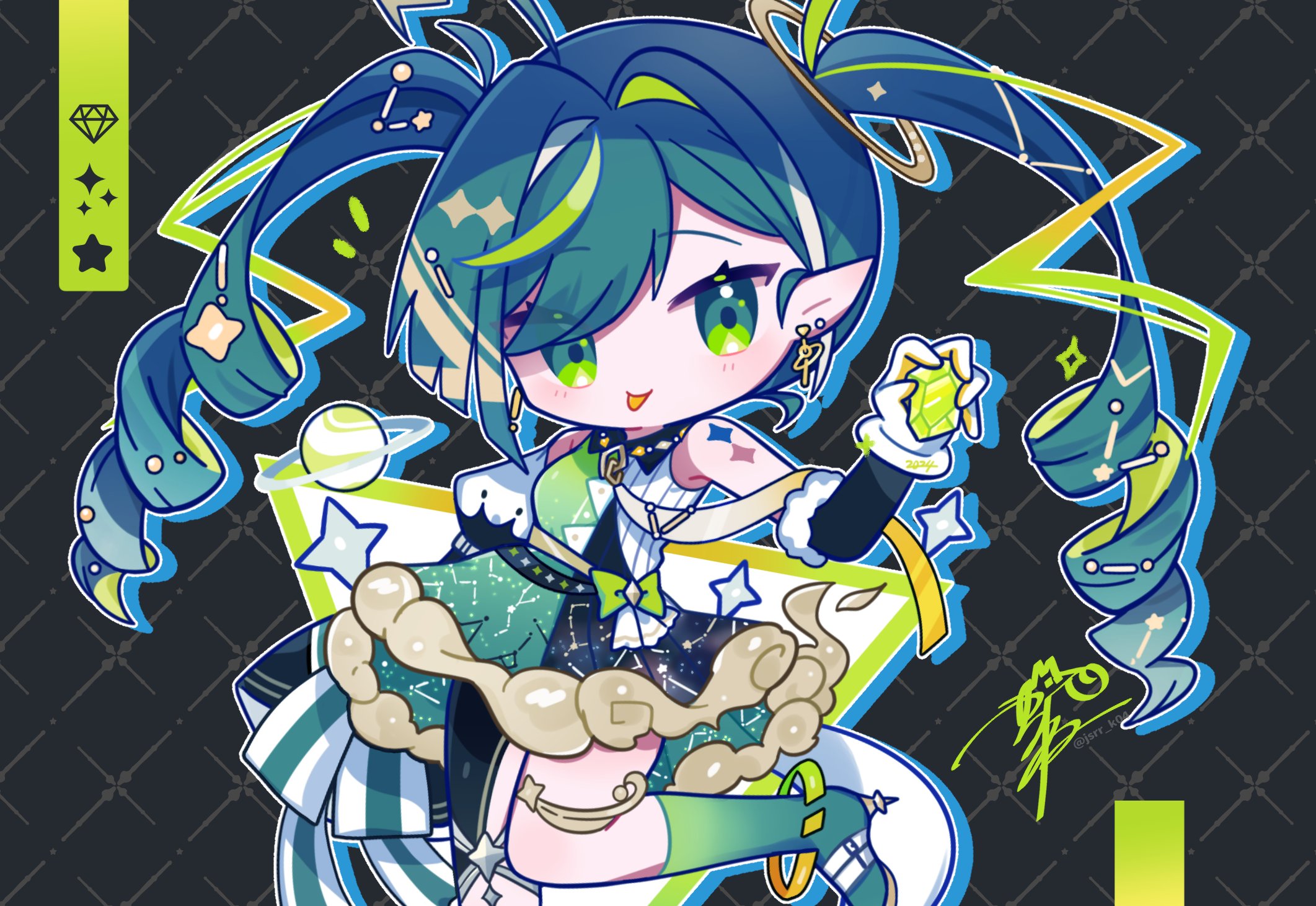 1girlbare shouldersblack backgroundblack glovesbootsclosed mouthdressearringselbow glovesfoot out of framefur trimfur-trimmed glovesglovesgreen bootsgreen dressgreen eyesgreen hairhigh heel bootshigh heelsjewelrylong hairlooking at vieweroutlinepointy earsshoulder tattoosleevelesssleeveless dresssmilesolostandingstanding on one legtattootonguetongue outtwintailswhite outline