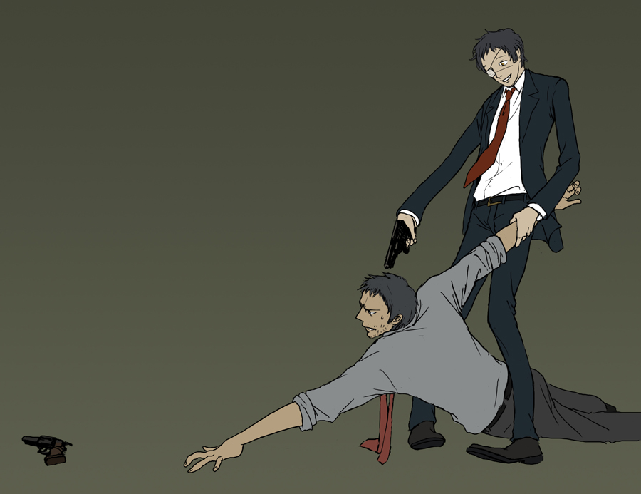 nagasawa shin, bad id, bad pixiv id, ass, black hair, blush, bodysuit, dark-skinned female, dark skin, flat chest, gun, holding hands, short hair, smile, thighhighs, weapon