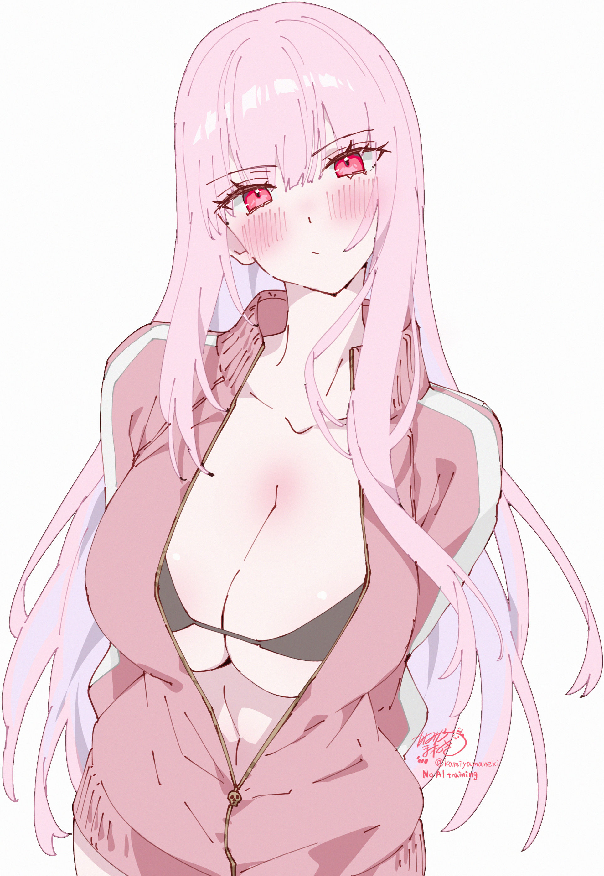 1girlartist namebikiniblack bikiniblushbreastscleavageclosed mouthcollarbonejacketlarge breastslong hairlong sleeveslooking at vieweropen clothesopen jacketpartially unzippedpink eyespink hairpink jacketsignaturesimple backgroundsoloswimsuittrack jackettwitter usernamevirtual youtuberwhite background