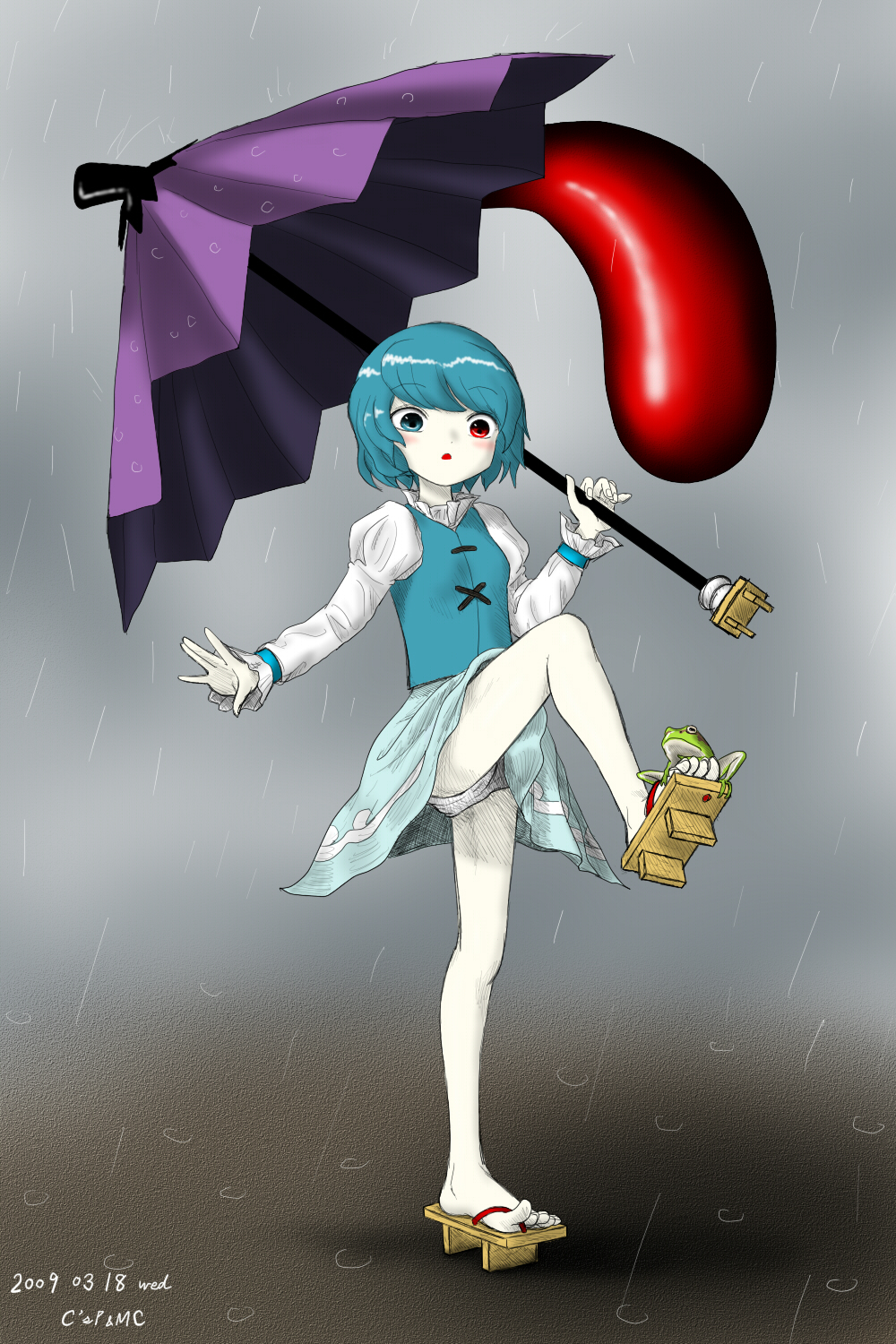 1girlblue eyesblue hairclothes liftfemale focusfrogfull bodygetagradient backgroundheterochromiakarakasa obakeleg liftmatching hair/eyespantiespantyshotrainred eyessandalsshort hairskirtskirt liftsolotongueumbrellaunderwear