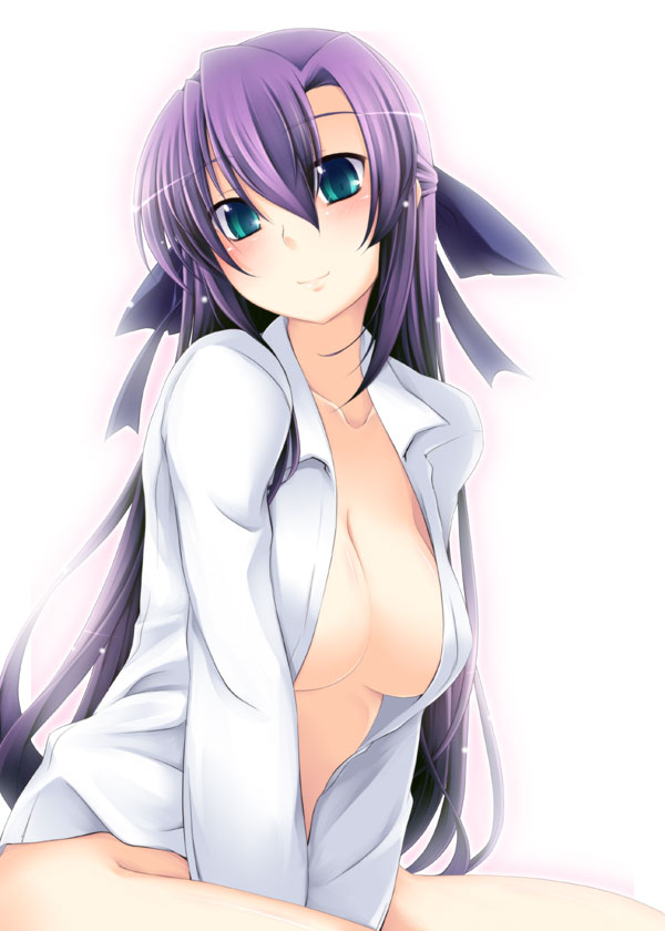 00s1girlbottomlessbreastsfemale focusgreen eyeshair ribbonlarge breastslong hairopen clothesopen shirtpurple hairribbonshirtsolovery long hair