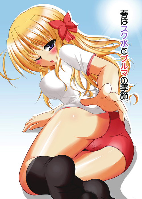 assblack socksblonde hairblue eyesblushburumagym uniformkneehighslong hairone eye closedsockswink