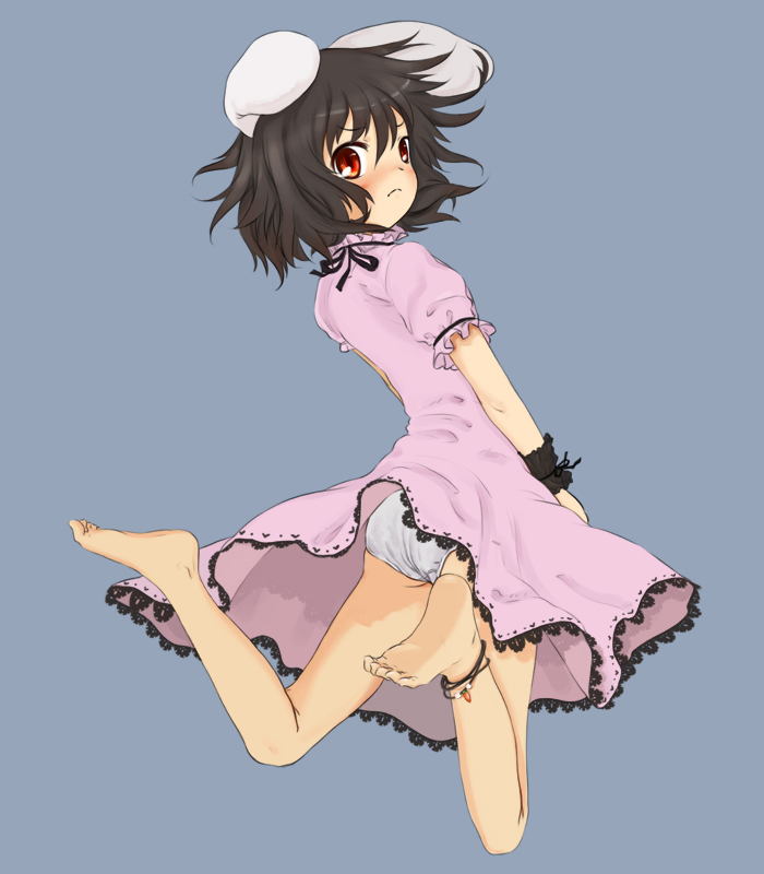 1girlanimal earsassbarefootblack hairdressfeetfemale focusfull bodypantiespantyshotrabbit earsred eyesshort hairsimple backgroundsolounderwearwrist cuffs