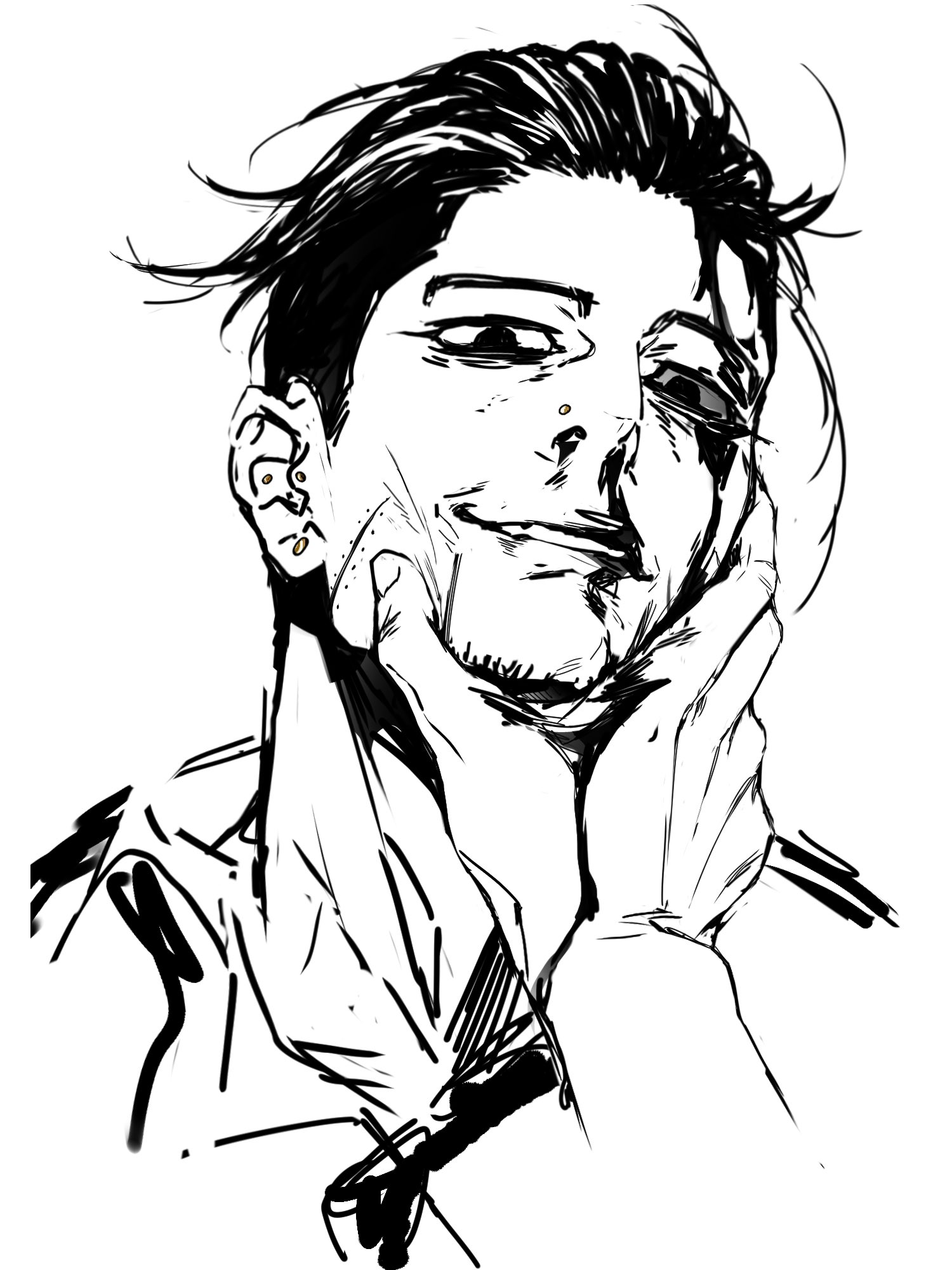 1boy1otherbloodbloody tearsfacial hairfacial scargoateehair slicked backhand on another's faceinjurylooking at viewermale focusnosebleedscarscar on cheekscar on faceshort sideburnssimple backgroundsketchsmilesolo focusteethwhite background