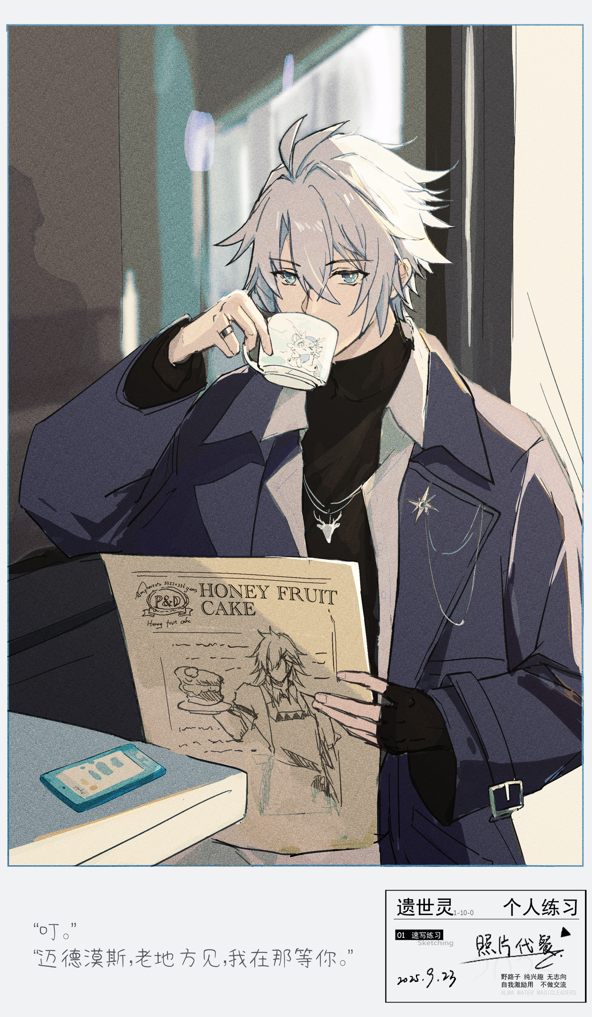 1-10-01boyantenna hairblack sweaterblue coatblue eyescoatcollared shirtcupholdingholding cupholding papermale focusofficial alternate costumeopen clothesopen coatpaperparted bangsshirtshort hairsolosweaterteacupturtleneckturtleneck sweaterwhite hairwhite shirt