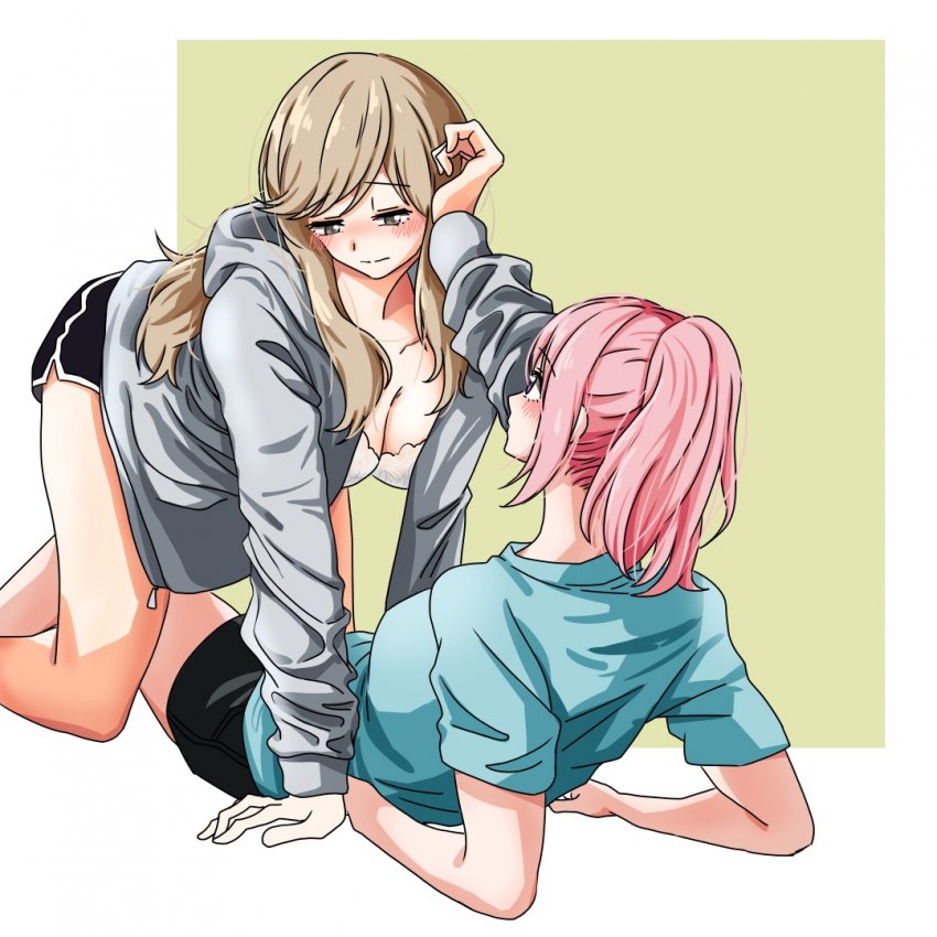 2girlsblonde hairblushdolphin shortsembarrassedlooking upmultiple girlson personpink hairshortsyuri