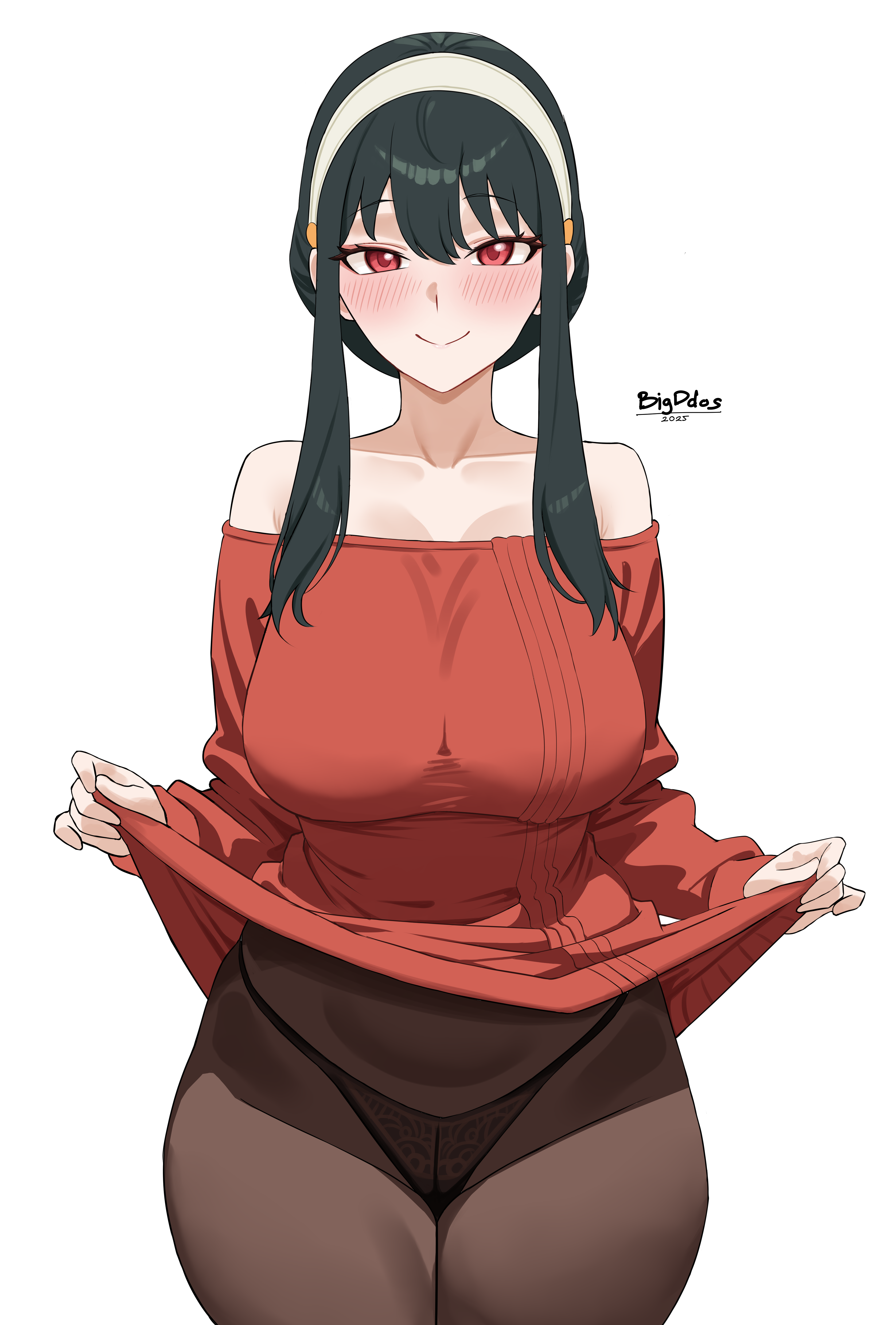 1girlartist namebare shouldersblack hairblack pantiesblushbreastsbrown pantyhoseclosed mouthcollarbonecowboy shotcurvydresshairbandlarge breastsoff shoulderoff-shoulder sweaterpantiespanties under pantyhosepantyhosered eyesred sweatersidelockssimple backgroundsmilesolosweatersweater dressthighsunderwearwhite backgroundwhite hairbandwide hips