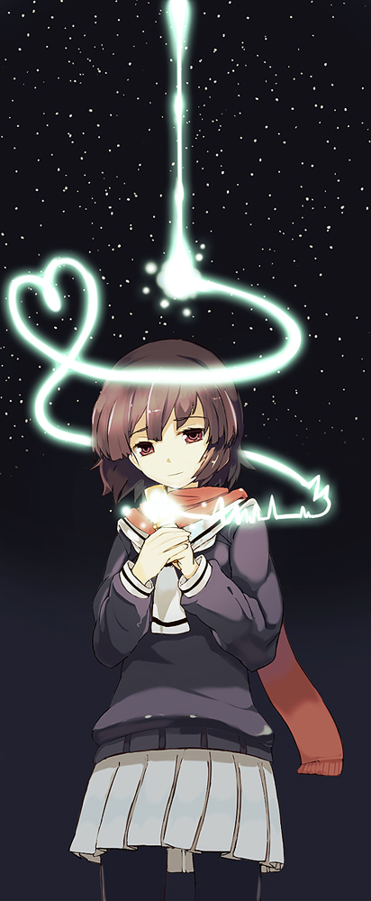 brown eyesbrown hairnightpantyhosescarfshort hairskirtskysmilesolostar (sky)star (symbol)starry skysweater