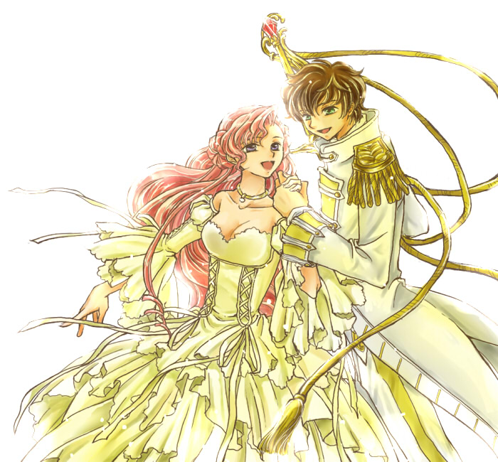 00s1boy1girlbreastsbrown haircleavagedonut hair bundressformal clothesgreen eyeshair bunlarge breastslong hairpink hairpurple eyessmilewide sleeves