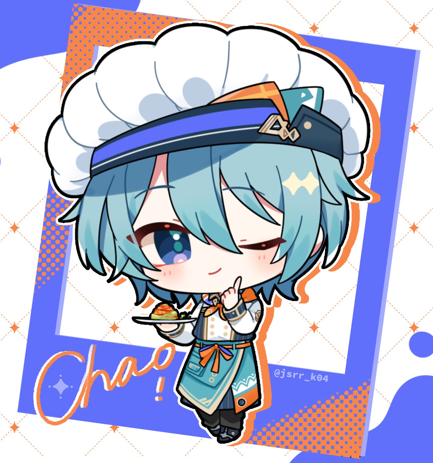 1boyapronblack shoesblack socksblue apronblue eyesblue hairblue pantsblushchef hatchibichibi onlyclosed mouthdrop shadowfoodfull bodyhair between eyeshatholdingholding traylong sleeveslooking at viewermale focusone eye closedoutlinepantsshirtshoesshort hairsmilesockssolostandingtrayvirtual youtuberwhite backgroundwhite hatwhite outlinewhite shirt