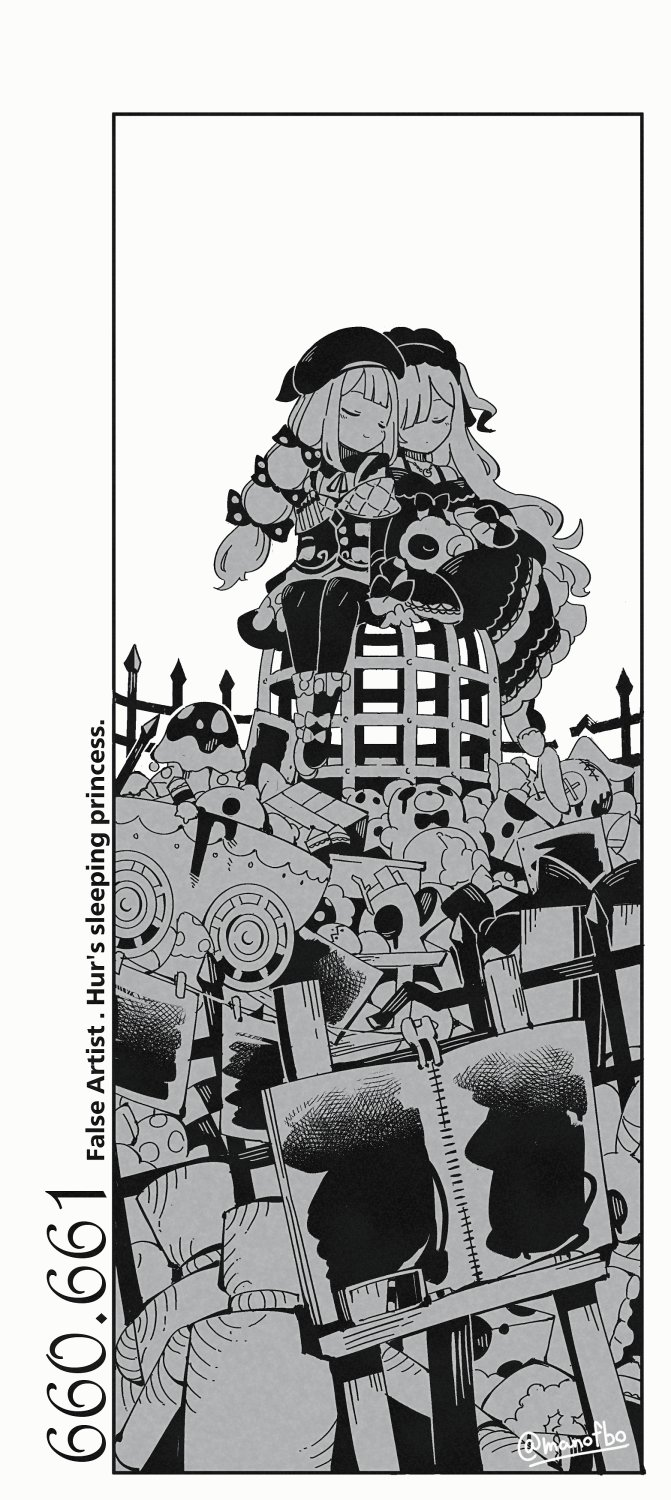 2girlsasymmetrical footwearberetbirdcagebowcageclosed eyescluttercrescentcrescent necklacedresseaselfencegiftgothic lolitahairbandhatiron fencejewelrylolita fashionlolita hairbandlong hairmonochromemultiple girlsmushroomnecklacepolka dotpolka dot bowsleepingsleeping on personstuffed animalstuffed sheepstuffed toytied sleevesvery long hair