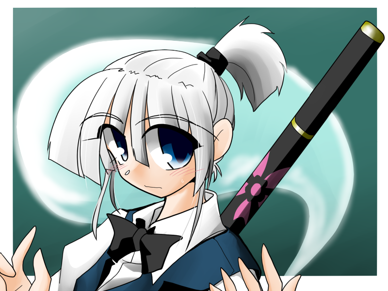 1girlalternate hairstyleblue eyesblushfemale focusgradient backgroundponytailsoloswordupper bodyweaponwhite hair