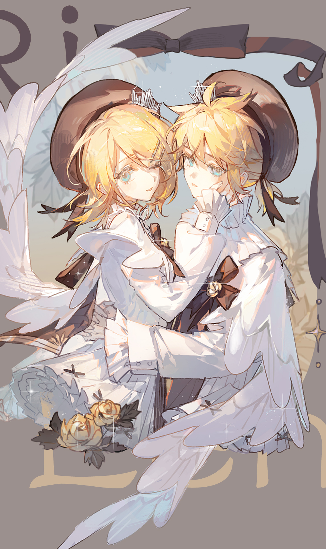 1boy1girlaqua eyesblonde hairbrother and sisterbrown hatcharacter namecropped torsofrom sidehand on another's cheekhand on another's facehathuginterlocked fingerslong sleeveslooking at viewerone eye closedparted lipssiblingswaist hug