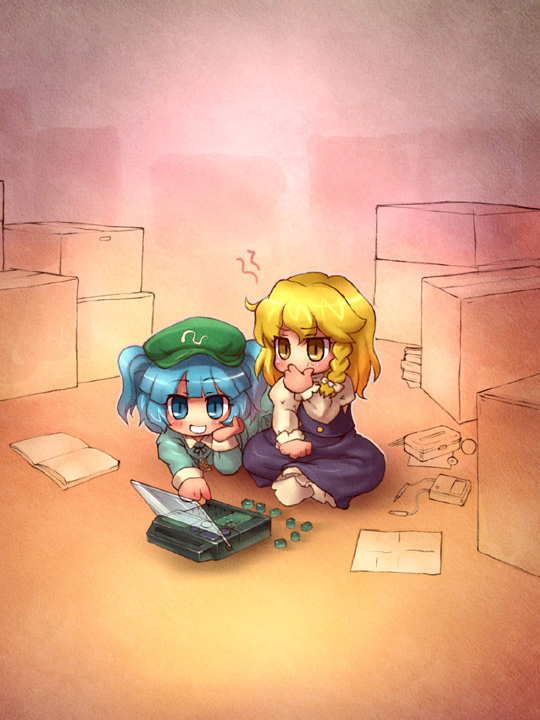 2girlsblonde hairblue eyesblue hairbraiddenshi blockfemale focusgradient backgroundhair ribbonhatindoorsmultiple girlsribbonshort hairside braidtwintailstwo side upyellow eyes