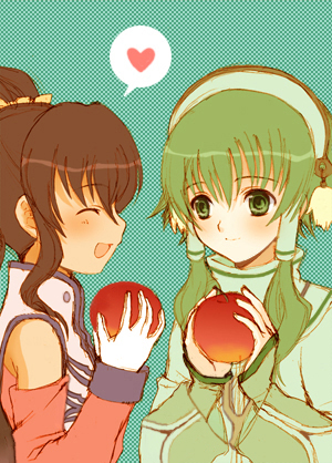 00s1boy1girlappleaqua backgroundclosed eyesfoodfruithair tubesheartholdingholding foodholding fruitshort hair with long locks