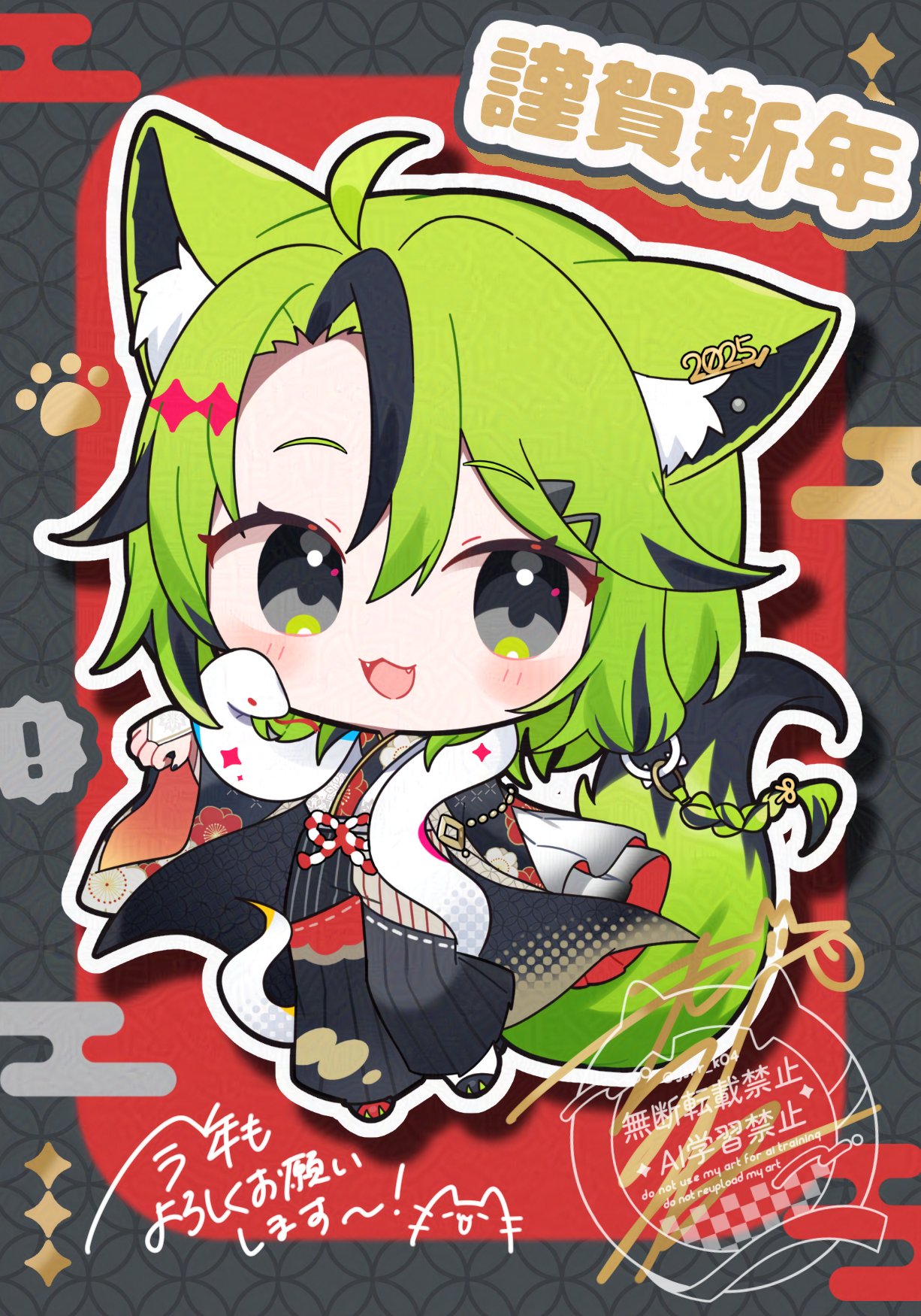 :3:d1girl2025animal ear fluffanimal earsblack hairblack kimonoblushchibichibi onlydrop shadowfangsfox earsfox girlfox tailfull bodygreen hairgrey eyeshair between eyesjapanese clotheskimonolong hairlong sleeveslooking at viewermulticolored hairnew yearopen mouthoutlinered backgroundsmilesnakesolostandingstreaked hairtailwatermarkwhite outlinewide sleeves