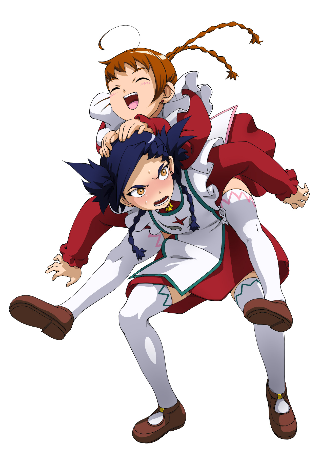 00s2girlsahogeangryapronbraidbrown haircarryingclosed eyesgarderobe uniformmultiple girlspiggybackpurple hairsimple backgroundsmilethighhighstwin braidswhite backgroundyellow eyes