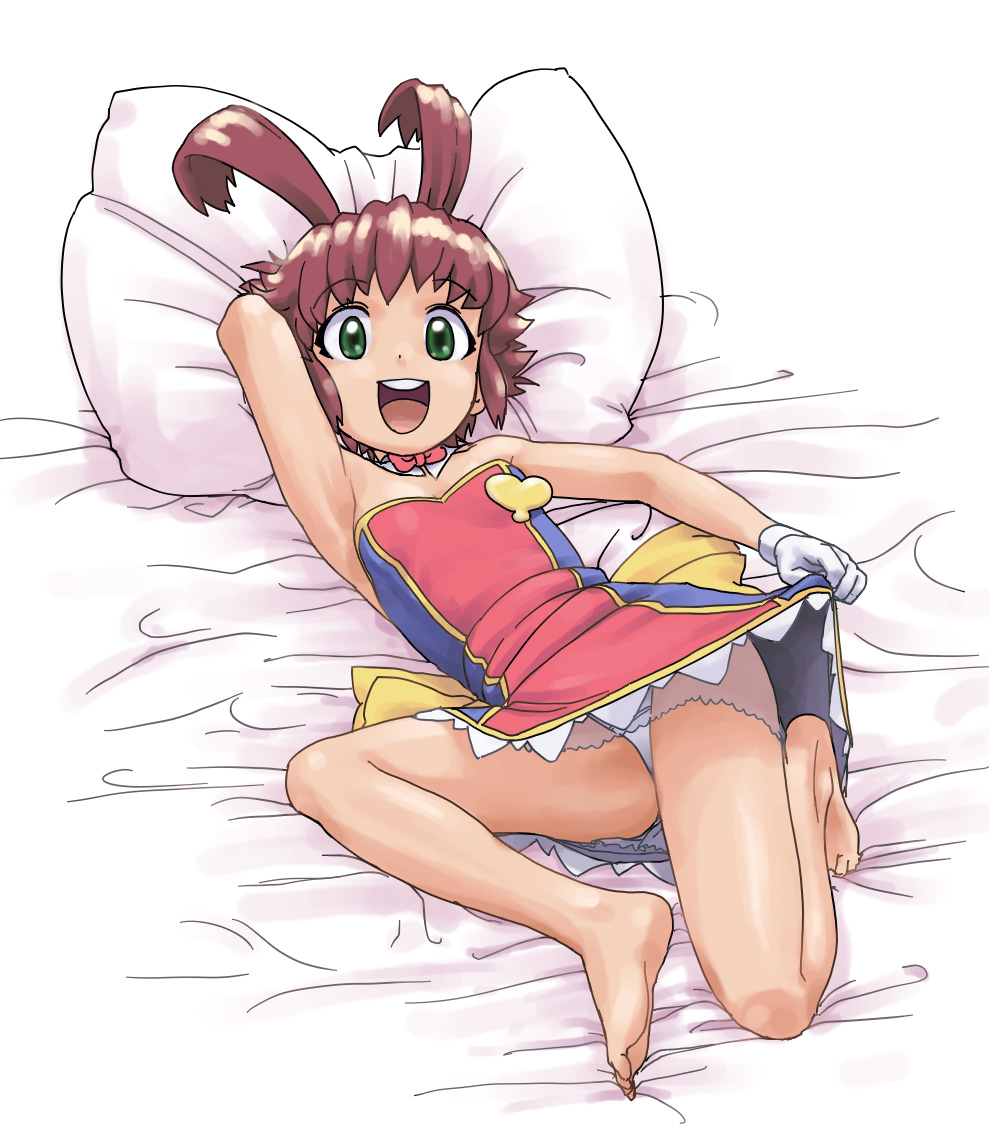 1girlarmpitsbarefootbedblushbrown hairclothes liftfeetfemale focusglovesgreen eyeslolilyingpantiespantyshotsalivaskirtskirt liftsmilesolounderwearupskirtwhite panties