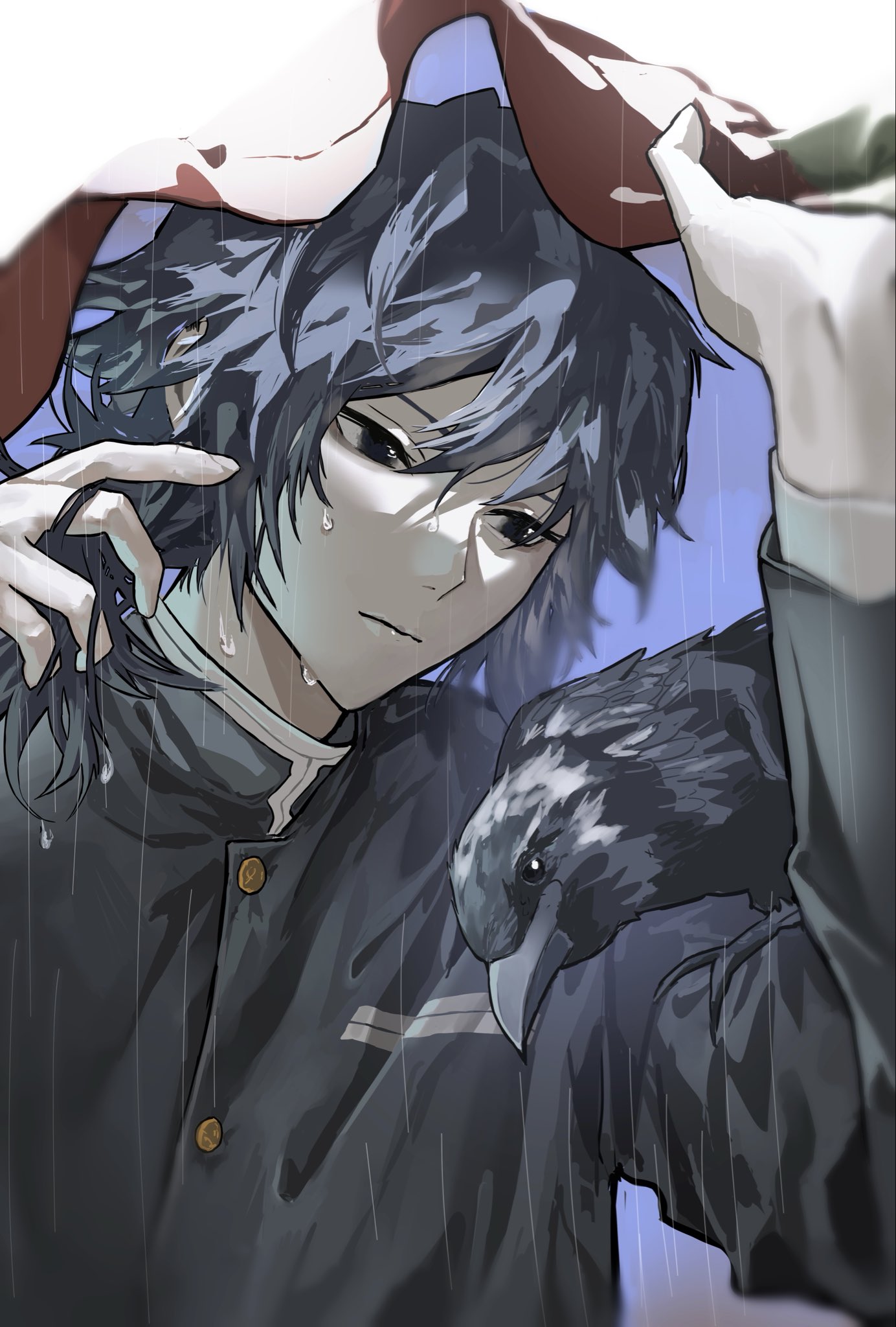 1boybirdblack hairblack jacketblue eyesclosed mouthcrowdemon slayer uniformhands uphaorihigh collarholdingjacketjapanese clotheslong hairlow ponytailmale focusoutdoorsponytailrainred haorisolospiked hairupper bodywet