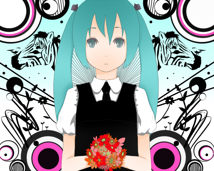 1girlexpressionlessfemale focusflowerformal clothesgreen eyesgreen hairlooking at viewermatching hair/eyesnecktieraised eyebrowssolotwintailszebra