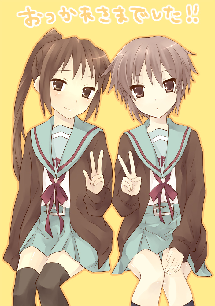 00s2girlsbrown eyesbrown haircardigangenderswapgenderswap (mtf)long hairmultiple girlsponytailschool uniformserafukushort hairsocksthighhighsv