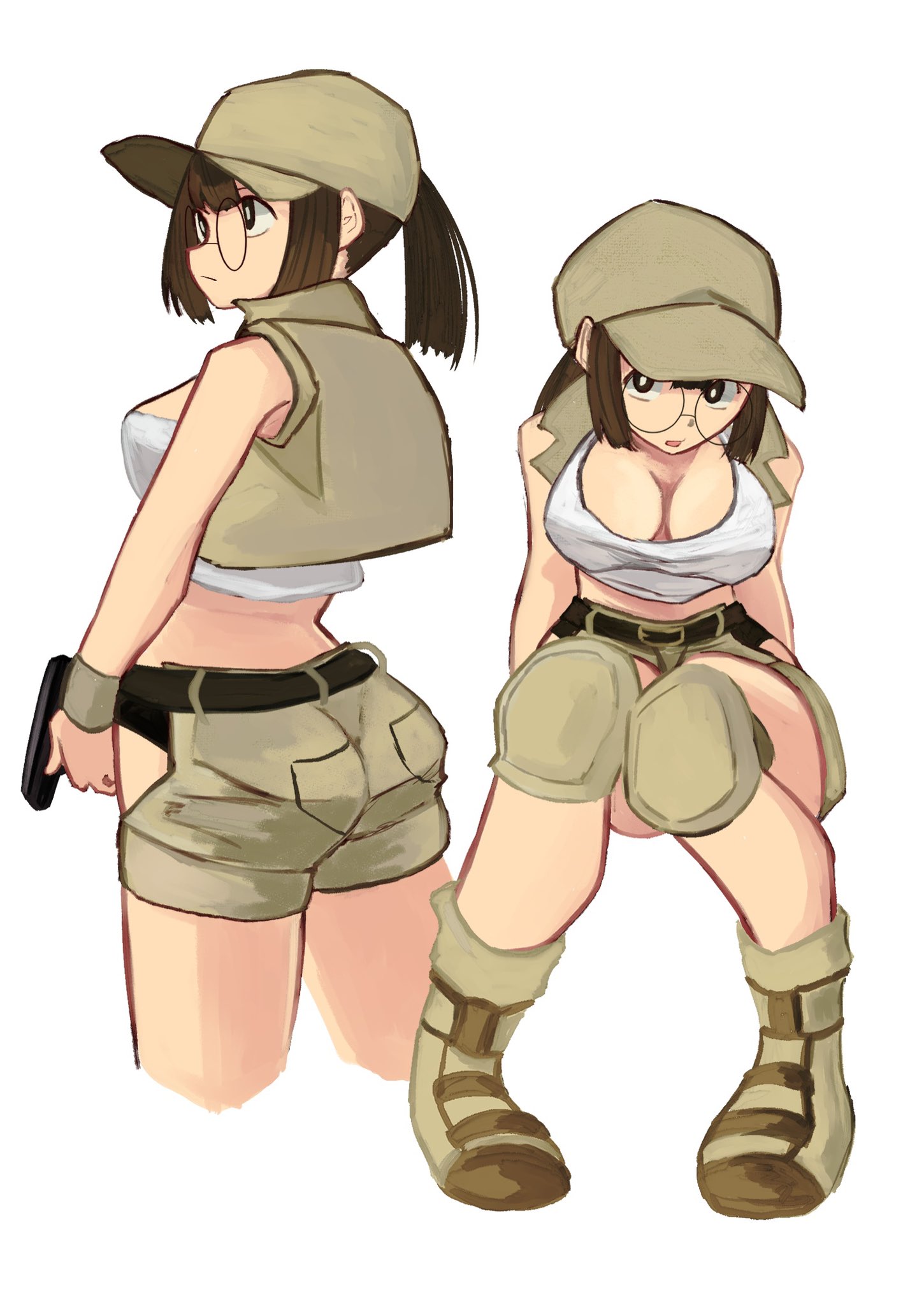 1girlbeltbootsbreastsbrown eyesbrown hairglasseshatlarge breastsmidriffmilitarymultiple viewsponytailshorts